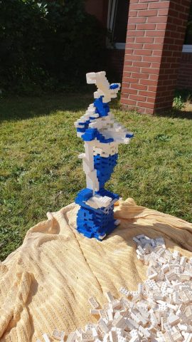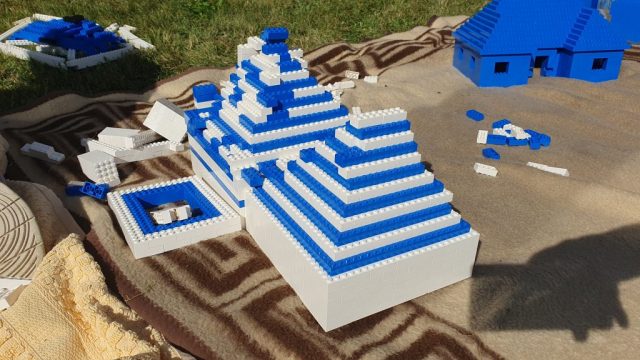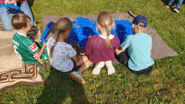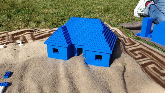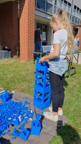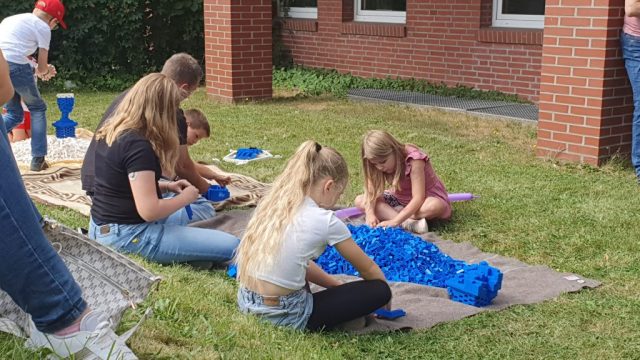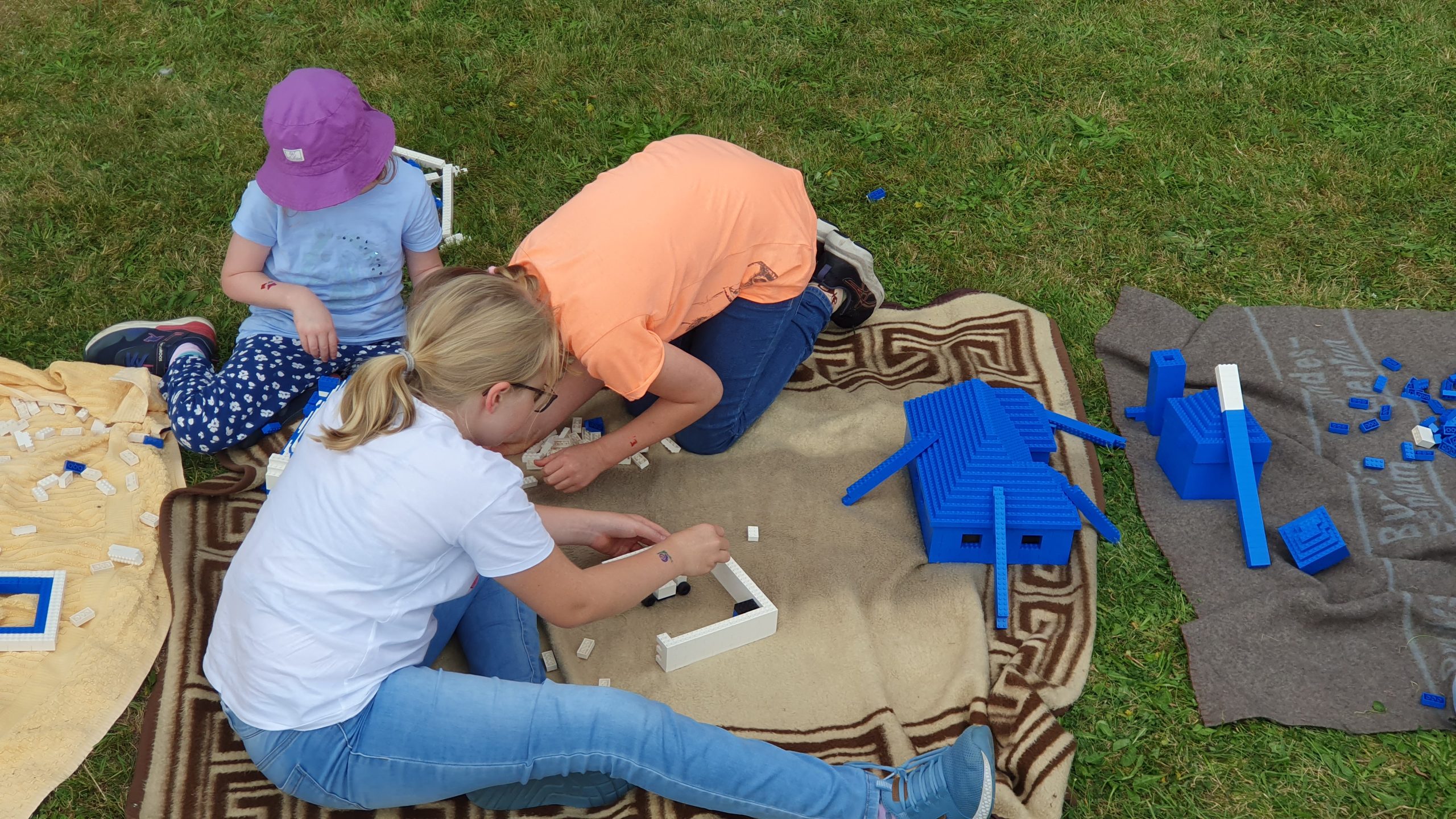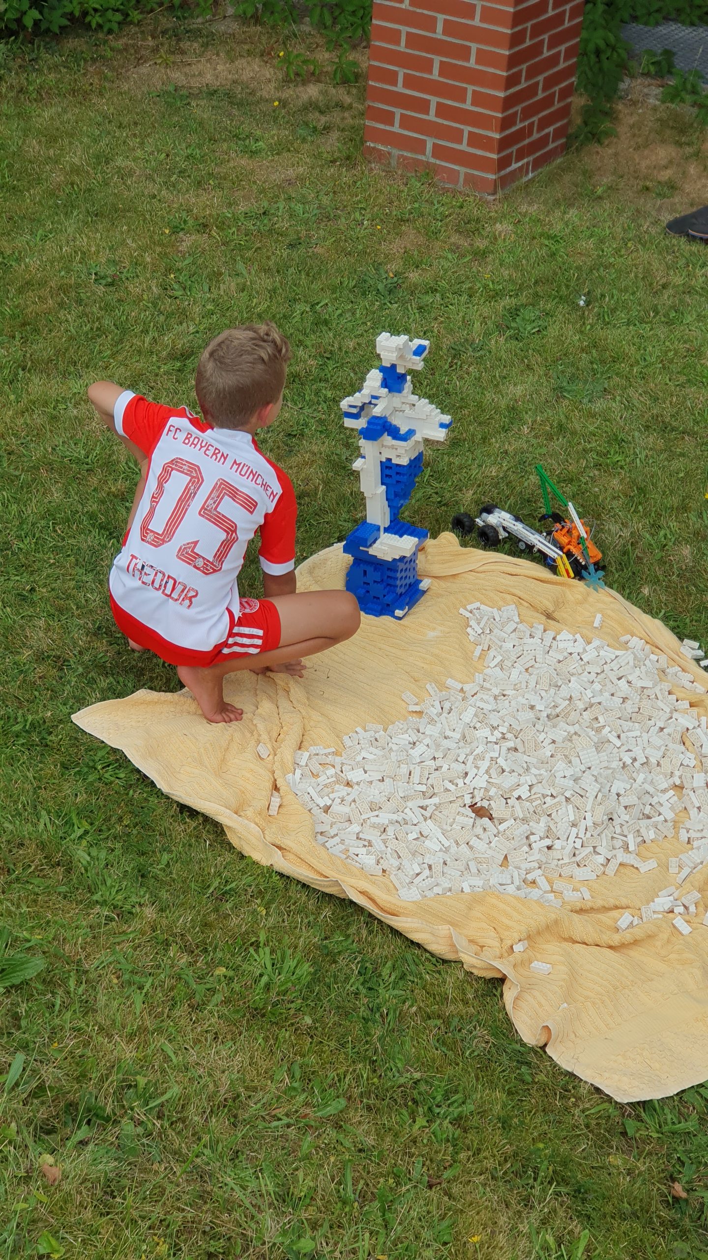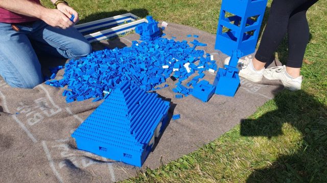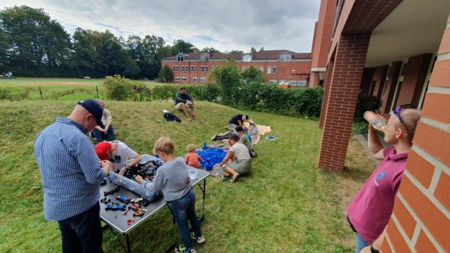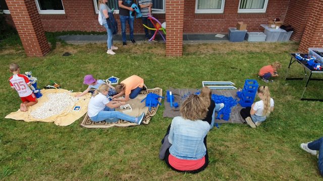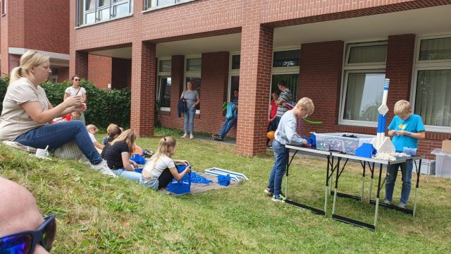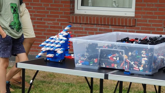 Auf einer freien Fläche im Außenbereich bauten Tommy und Marco eine bunte LEGO-Spielwelt auf. In der LEGO Ecke standen klassische 2×4 Steine in den Farben Weiß und Blau zur Verfügung, mit denen die Kinder – und auch viele Erwachsene – nach Herzenslust bauen konnten.