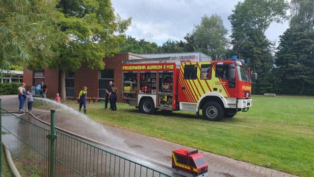 Ein spannender Stand der Freiwilligen Jugendfeuerwehr Aurich, bei dem die Kinder ein Feuerwehrfahrzeug bestaunen konnten